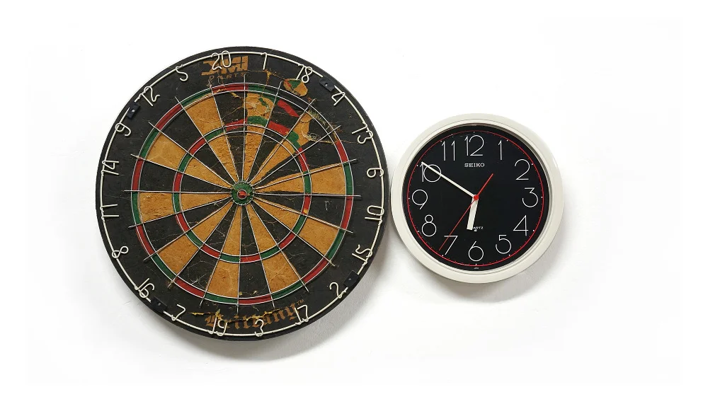 Agustina Woodgate, Hemispheres Destiny, Found dart board, clock, rotation motor, 15″ x 35″ x 3″, 2013